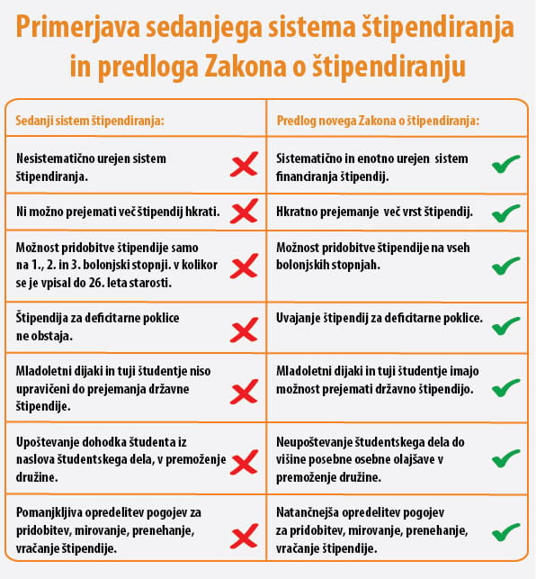 Predlagani zakon poleg navedenega določa nove vrste štipendij, omogoča prejemanje več vrst štipendij hkrati, viša osnovno višino štipendij, omogoča prejemanje štipendij na vseh stopnjah bolonjskega študija za celotno obdobje trajanja študija, znova podeljuje štipendije mladoletnim dijakom in tujim študentom … poleg obstoječih dodatkov, kot so dodatek za izobraževanje izven kraja prebivanja, dodatka za uspeh in dodatka za štipendiste s posebnimi potrebami, zakon uvaja še dodatek za izjemni dosežek na posameznem področju družbenega življenja.
